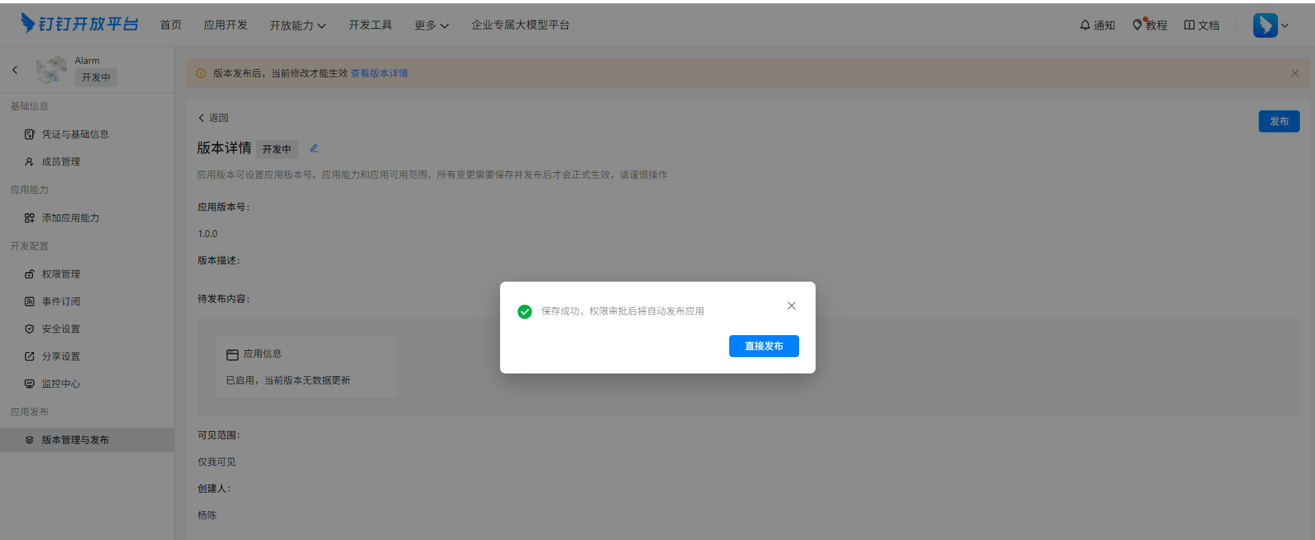 点击直接发布,发布应用